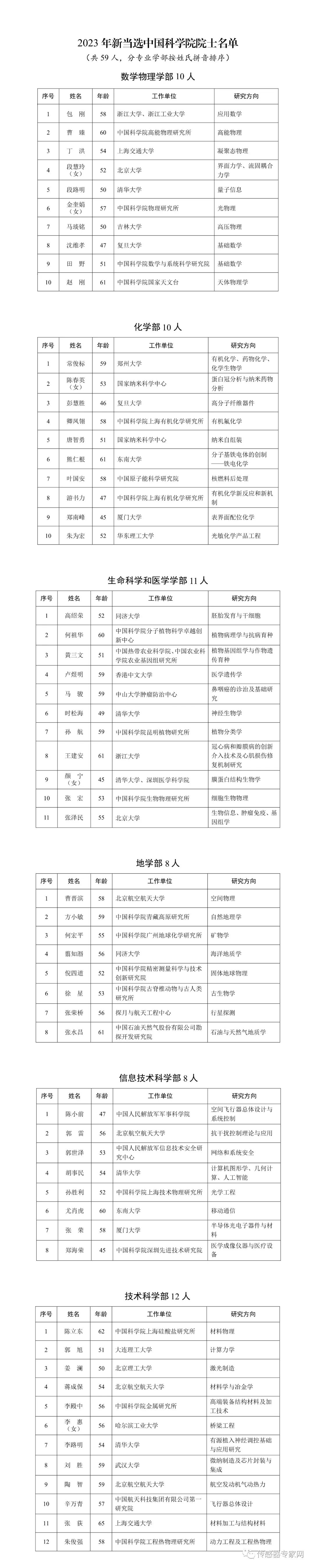 2023年新當(dāng)選中國科學(xué)院院士名單【全】(可上下滑動查看,可點(diǎn)擊放大查看)