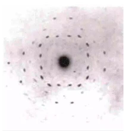 大約在 1912 年 1 月底,德國物理學家索末菲 (A. Sommerfeld,1868~1951) 的一位學生厄瓦爾德 (P. Ewald) 在準備博士論文過程中,為研究光波在晶格中 的行為而尋找數學處理方法時遇到了一些困難,為此 他向勞厄 (M. Laue)( 見圖 6) 請教。在他們的探討中勞 厄了解到晶體中原子間的距離很小,與可見光的波長 相比大概只有波長的 1/500 或 1/1000。勞厄想到,雖然人工做不出這樣細的光柵,但自然界中的晶體也許能行。晶體是一種幾何形狀整齊的固體,而在固體平 面之間有特定的角度,并且有特定的對稱性。這種規(guī)律是構成晶體結構的原子有次序地排列的結果。一層原子和另一層原子之間的距離大約是 X 射線波長的大小。如果這樣,晶體應能使 X 射線衍射。勞厄醞釀出一個實驗:把晶體當作一個三維光柵,讓一束 X 射 線穿過,由于空間光柵的間距與 X 射線波長的估計值在數量級上近似,可期望觀察到衍射譜。雖然勞厄的想法受到索末菲和維恩 (W. Wien) 等著名物理學家的懷疑,但是在索末菲的助手弗里德里希 (W. Friedrich) 和倫琴的博士研究生克尼平 (P. Knipping) 的支持和參與下,他們終于成功地觀察到 X 射線透過硫酸銅后的衍射斑點。通過改進儀器設備數周后他們照出更為清晰的 ZnS、PbS 和 NaCl 等晶體的 X 射線衍射圖 ( 如 圖 7 所示 )。