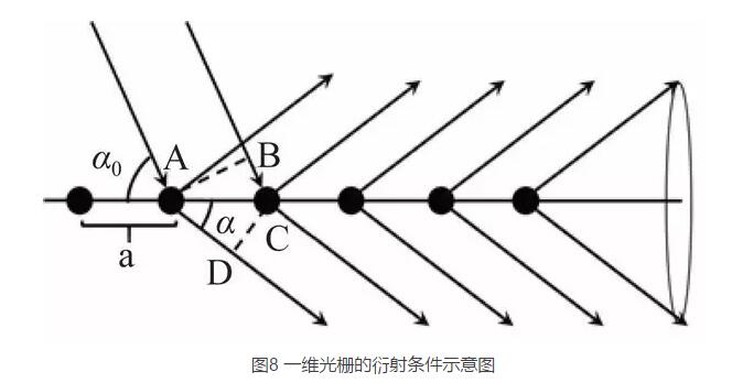 這里先討論一維光柵,如圖 8 所示,當光入射到光柵常數為 a 的一維光柵時,光將發(fā)生衍射。形成衍射極大 ( 即亮條紋 ) 的條件是光程差為波長的整數 倍。由圖 8 可知相鄰衍射光線的光程差為距離為 BCAD,由此可得一維光柵衍射的理論公式: