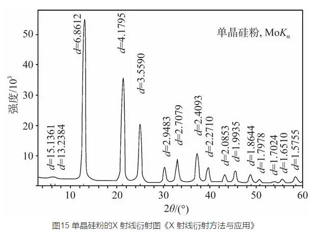現代的 X 射線衍射儀的原理如圖 14 所示,從 X 射線管射出的 X 射線經準直后照射在樣品上;在測量 過程中樣品在計算機的控制下勻速轉動,其入射角以 一定的角速度變化,測量衍射光強的探測器則以 2 倍于入射角的角速度變化;由此來記錄衍射光強隨入射角的變化,從而測出各個晶面間的面間距。圖 15 給 出了比較典型的粉末晶體 Si 的 X 衍射圖,每一個衍射峰對應一簇晶面的面間距,通過計算機與已知晶體的衍射資料庫進行比對即可確定樣品是什么晶體,或者發(fā)現新的晶體。