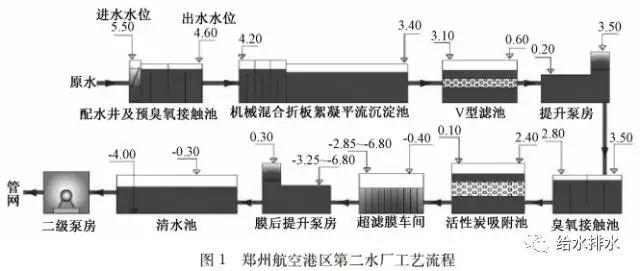 (1)混凝沉淀+砂濾+中間提升+臭氧活性炭。由圖1可知,炭吸附池出水水頭為0.10 m,清水池進水水位為-0.30 m,炭吸附池出水可以重力流入清水池,實現(xiàn)超越超濾膜的工況。
