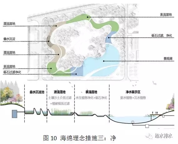 凈:通過植被、綠地系統(tǒng)、水體等,對水質產(chǎn)生凈化作用。該工程通過在蓄水池岸邊以及水中設置疊水沉淀池、潛流+表流濕地、挺水和沉水植物對雨水進行凈化(見圖10)。