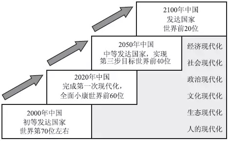 第一個臺階,從2000年到2020年左右,完成第一次現代化,全面建成小康社會,實現工業化、城市化、民主化、市場化和福利化,國家現代化水平進入世界前60名。