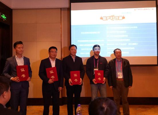 頒獎留念(左至右:重慶永生銷售經理沈榮華,奧龍星迪總經理費宏,丹東百特總經理董青云,濟南微納總經理任飛,中國儀器儀表行業(yè)協(xié)會高級顧問閆增序)