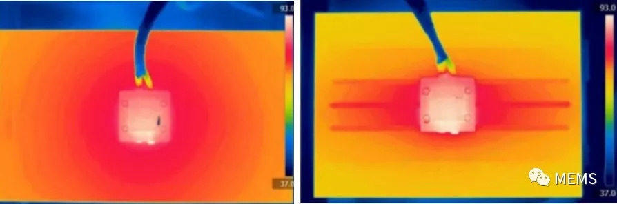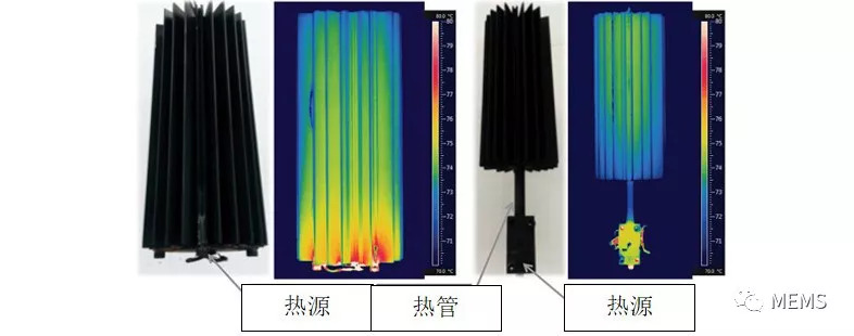 ►左圖:熱源和傳統(tǒng)散熱片直接接觸,散熱片溫度呈現(xiàn)明顯的熱梯度分布;