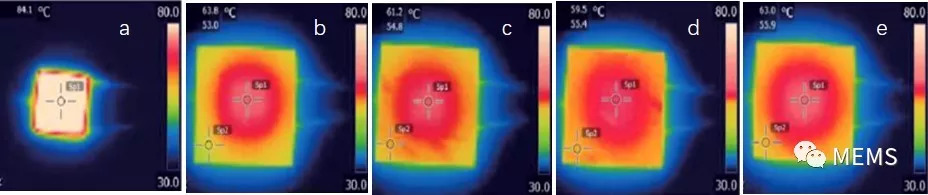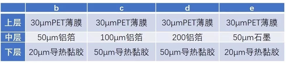 下圖為不同規(guī)格的散熱薄膜材料的篩選對(duì)比,其中a為對(duì)照組,熱源不做任何散熱措施,b~d熱像圖所用散熱材料從上到下的微觀分層為:
