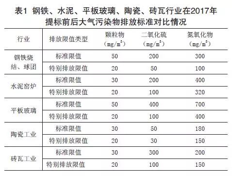 表1為鋼鐵、水泥、平板玻璃、陶瓷、磚瓦行業(yè)在2017年提標前后排放標準的對比情況。