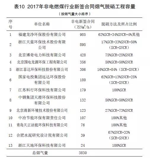 表10給出了參與調(diào)查各會員企業(yè)2017年新簽合同非電燃煤煙氣脫硝工程處理煙氣量情況,不包括歷史累計煙氣量。截至2017年底,參與調(diào)查企業(yè)的全國非電燃煤新簽合同脫硝工程總煙氣量為3830萬Nm3/h。