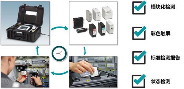 以小菲為代表的全球知名電涌保護器生產(chǎn)商會向客戶提供可攜帶的檢測設備,對現(xiàn)場的SPD進行質(zhì)量檢查。這一類檢測設備內(nèi)置微型沖擊發(fā)生器,能夠較為精準地判斷產(chǎn)品的好壞。菲尼克斯電氣Checkmaster2產(chǎn)品能夠?qū)Ψ萍宜锌刹灏坞娪勘Wo器進行現(xiàn)場檢測,方便快捷。