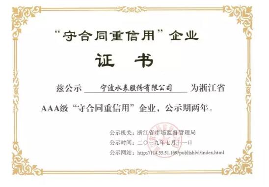 近日,憑借多年來的誠信經(jīng)營記錄和良好的合同履約能力,寧波水表股份有限公司順利通過浙江省市場監(jiān)督管理局的專項考察評選,成為2019年度“浙江省守合同重信用AAA級企業(yè)”。