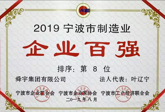 2019寧波市制造業(yè)企業(yè)百強第8位(較去年上升1位)