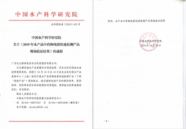 2019年10月16-18日,廣東達(dá)元綠洲食品安全科技股份有限公司參加了由農(nóng)業(yè)農(nóng)村部漁業(yè)漁政管理局主辦,中國水產(chǎn)科學(xué)研究院承辦的“2019年水產(chǎn)品中藥物殘留快檢產(chǎn)品的驗(yàn)證”工作,食安科技生產(chǎn)的孔雀石綠快速檢測盒(FST-膠體金)、氯霉素快速檢測盒(膠體金)、呋喃類代謝物快速檢測盒(膠體金)、呋喃類代謝物快速檢測盒(FST-熒光層析)等10項(xiàng)產(chǎn)品全部通過驗(yàn)證!