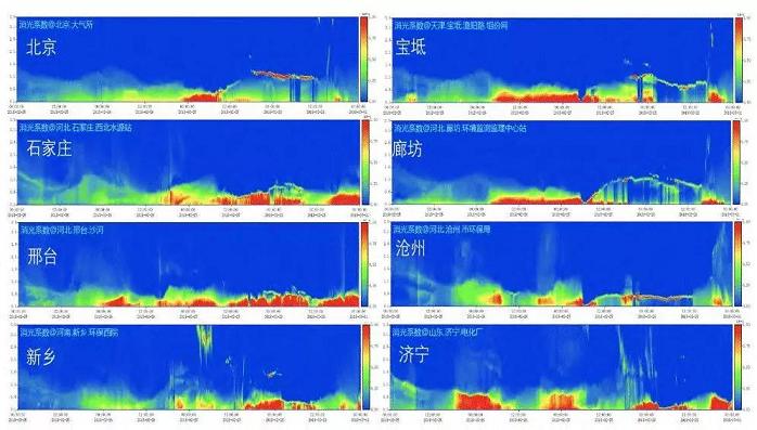 在2017年9月實施的“大氣重污染成因與治理攻關項目(總理基金)”中,中國科學院安徽光學精密機械研究所聯合國內其他院所高校在京津冀地區建立了16個地基立體觀測站點,開展了基于激光雷達等儀器的顆粒物立體探測研究。圖6為2017年12月25-30日激光雷達觀測的一次污染過程。12月27日下午京津冀地區污染物主要分布在1km以下,28日高空1km污染團與近地面污染混合,污染過程持續,28日夜間-29日凌晨,混合層高度降低,局地污染加劇至30日,30日下午混合層抬升,風速增大,擴散條件轉好,污染消散。地基單點固定式激光雷達的長期觀測十分必要,對于研究和統計分析一些重要大氣成分的變化規律具有重要價值。但車載、船載和機載式的可移動式平臺,機動性強,更適合應急和特殊環境的觀測,如機載式和船載式可以在海洋上空觀測,其觀測資料更能代表區域性大氣成分的分布??傊嗥脚_、多類型雷達的聯合運用,在一些區域性乃至全球性大氣輻射和環境研究的對比實驗中發揮了重要作用。