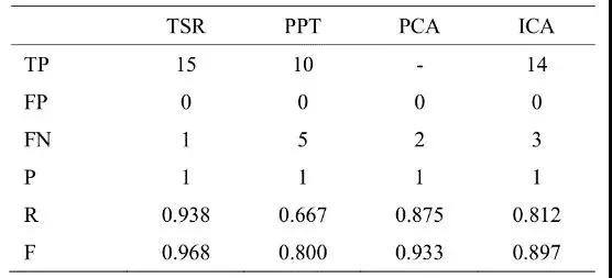 另外作者針對復合材料出現的脫粘缺陷采用了不同的圖像序列算法進行實驗對比,包括溫度信號重構、脈沖相位法、主成分分析、獨立成分分析,最終證明TSR和PCA在缺陷特征提取方面效果更好,如表3。再采用區域生長法對TSR獲得的特征圖進行分割和K最鄰近(K-nearestneighbor,KNN)分類算法進行分類識別,最終成功檢測出金屬結構材料的全部缺陷(最小直徑2mm)和蜂窩芯結構材料大于3mm的缺陷。