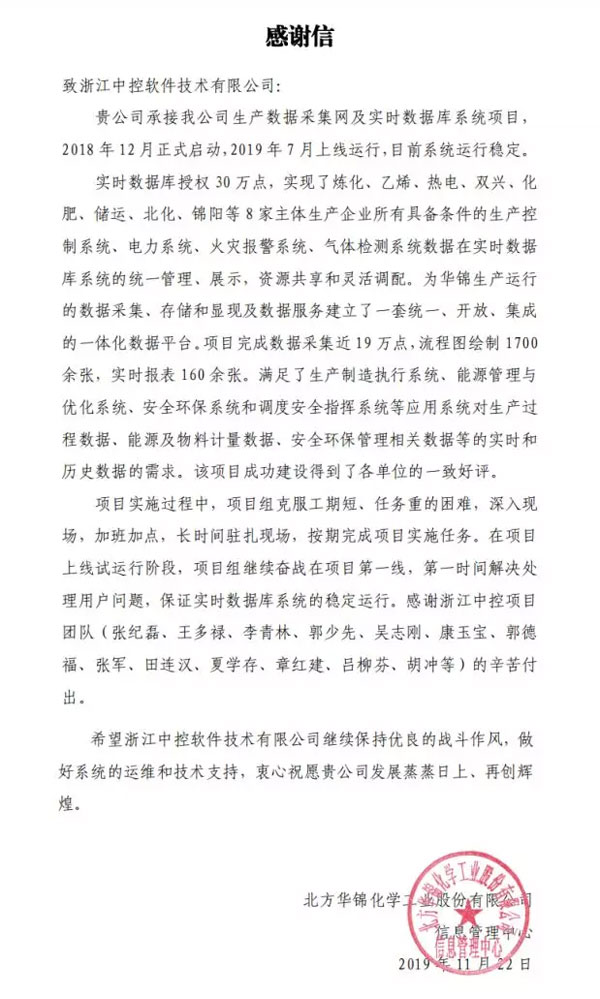 12月12日,中控承建的北方華錦生產數據采集網及實時數據庫系統項目在項目組的共同努力和各相關單位大力支持下,完成了所有實施工作,順利通過驗收。