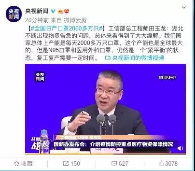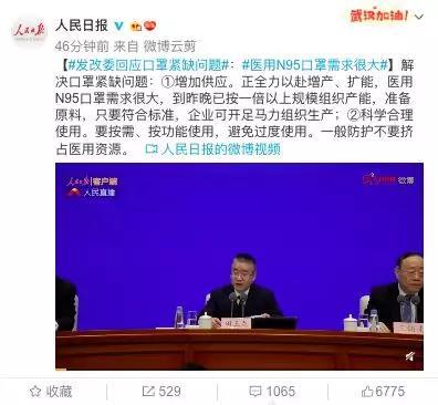 發(fā)改委也回應(yīng)口罩緊缺問題:①增加供應(yīng)。正全力以赴增產(chǎn)、擴(kuò)能,醫(yī)用N95口罩需求很大。②科學(xué)合理使用。要按需、按功能使用,避免過度使用,一般防護(hù)不要擠占醫(yī)用資源。