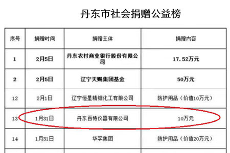 公司總經(jīng)理董青云、副總經(jīng)理劉忠蘭鼎力支持公司黨支部發(fā)起的“抗疫情,獻力量”捐款倡議。他們在代表公司向丹東慈善總會捐款10萬元后,指示將庫存的一百多只紅外線體溫槍捐贈給企業(yè)和社會各界用于防控疫情,又積極參加黨支部發(fā)起的捐款活動,表現(xiàn)出了企業(yè)家胸懷國家、無私奉獻的情懷。