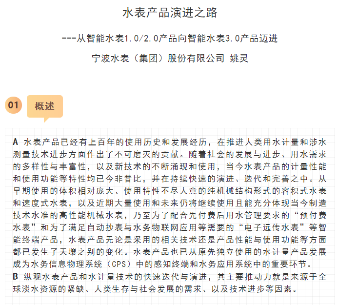 核心閱讀:寧波水表(集團)股份有限公司是中國儀器儀表行業(yè)協(xié)會行業(yè)協(xié)會副理事長單位,是一家具有六十余年歷史的水計量行業(yè)領軍企業(yè),隨著科學技術(shù)的發(fā)展,公司率先啟動智能水表的商用研究。本文介紹一下寧波水表(集團)股份有限公司和智能水表3.0產(chǎn)品(管網(wǎng)參數(shù)綜合采集中心專題)的詳細情況。