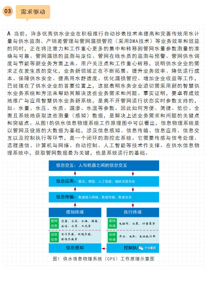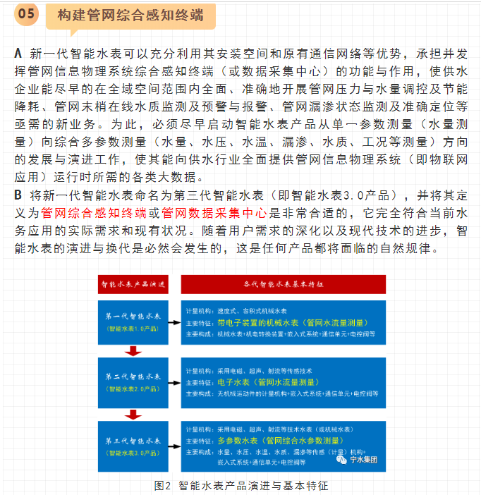 寧水集團2019年初在主板A股上市后,進一步確立了服務于智慧供水新業(yè)務的戰(zhàn)略方針與目標,在持續(xù)做好水表產(chǎn)品水計量性能提升、以NB-IoT及5G技術(shù)等為代表的無線數(shù)據(jù)遠傳業(yè)務拓展以及DMA分區(qū)計量漏損監(jiān)測、水務信息化應用等工作基礎上,正在努力向供水管網(wǎng)數(shù)據(jù)綜合提供商和智慧供水核心業(yè)務服務商轉(zhuǎn)型與升級,其近中期目標是向供水企業(yè)提供在線一體化的高性價比管網(wǎng)綜合大數(shù)據(jù)感知裝置(包括:水量、水壓、水質(zhì)、漏滲、水溫等參數(shù)),為智慧供水新業(yè)務及水務信息化云平臺提供海量數(shù)據(jù)支撐,使現(xiàn)有水力、水質(zhì)、漏損、能耗等水務管網(wǎng)模型運行準確度能夠顯著提升。