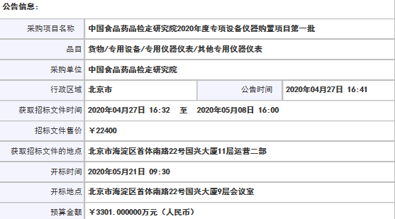 近30年來,中檢院通過實施“人才興檢”和“科技強檢”的戰略,開創了許多科技成果。面向未來,中檢院還將堅持發揮為國把關、為民負責的重要作用,以檢驗檢測能力建設為核心,努力譜寫新時代藥品檢驗檢測事業的新篇章。為此,中檢院決定采購一批科學儀器助陣,特委托國信國采(北京)招標咨詢有限責任公司,根據《中華人民共和國政府采購法》等有關規定,對中國食品藥品檢定研究院2020年度專項設備儀器購置項目第一批進行公開招標。公告發布于中國政府采購網。
