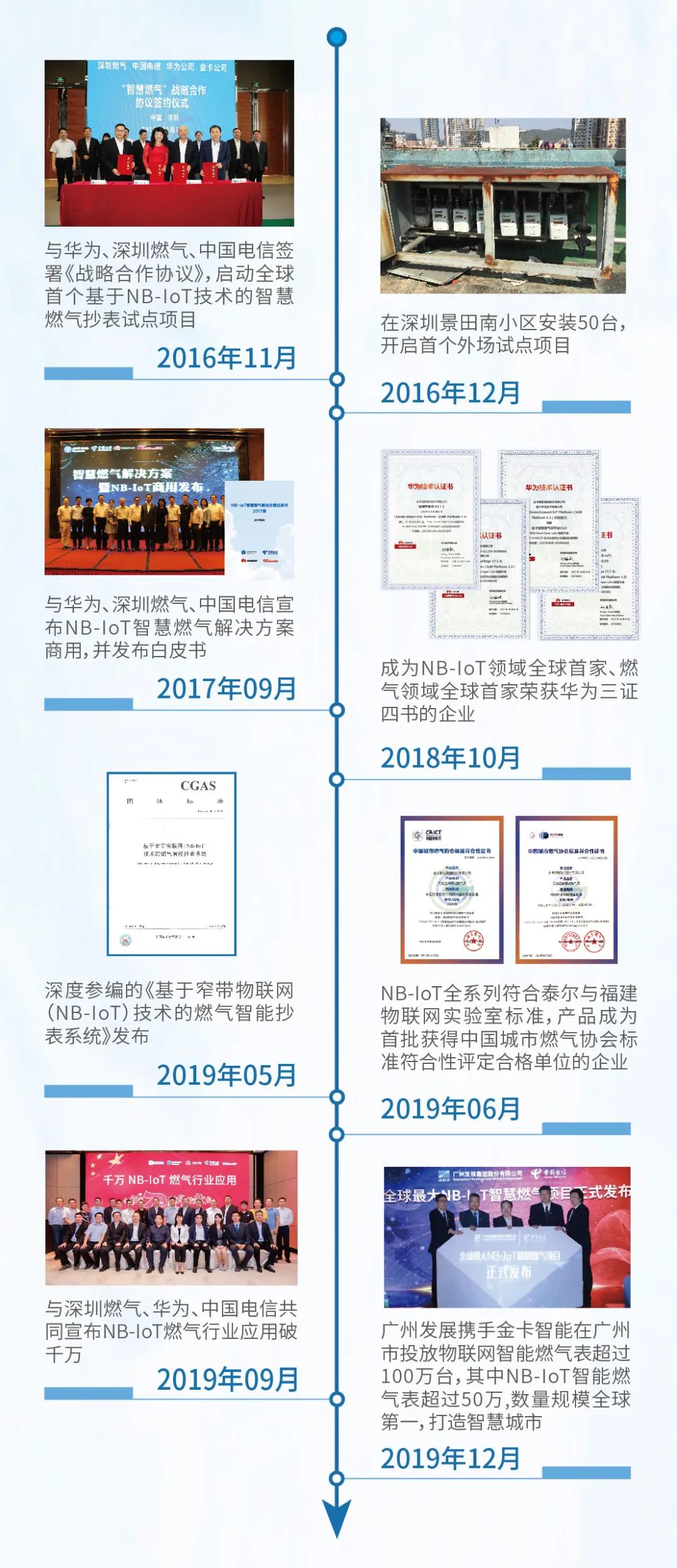 NB-IoT技術作為5G分支之一,成為推動行業數字化轉型利器。金卡智能從技術研發、標準制定、市場推動、生態建設等方面積極促進NB-IoT技術在燃氣行業的應用。2016年7月,第一臺NB-IoT智能燃氣表在華為實驗室完成測試,隨著基于NB-IoT技術在燃氣行業生態建設不斷深入,NB-IoT智慧燃氣解決方案在國內外得以廣泛部署。