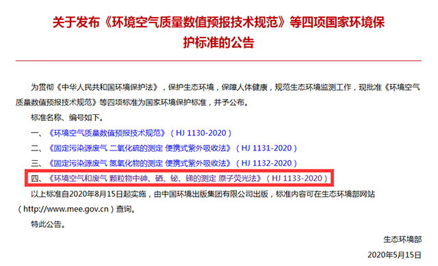 為貫徹《中華人民共和國(guó)環(huán)境保護(hù)法》和《中華人民共和國(guó)大氣污染防治法》,進(jìn)一步完善國(guó)家生態(tài)環(huán)境保護(hù)標(biāo)準(zhǔn)體系,近日,生態(tài)環(huán)境部發(fā)布四項(xiàng)國(guó)家生態(tài)環(huán)境保護(hù)標(biāo)準(zhǔn),其中《環(huán)境空氣和廢氣 顆粒物中砷、硒、 鉍、銻的測(cè)定 原子熒光法》(HJ 1133-2020),規(guī)范了環(huán)境空氣和廢氣顆粒物中砷、硒、鉍、銻的測(cè)定方法。該標(biāo)準(zhǔn)為首次發(fā)布,自2020年8月15日起實(shí)施。