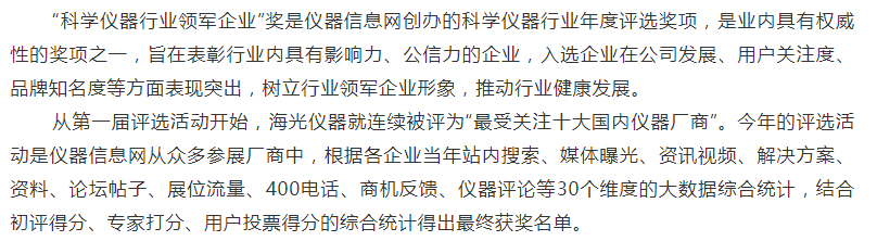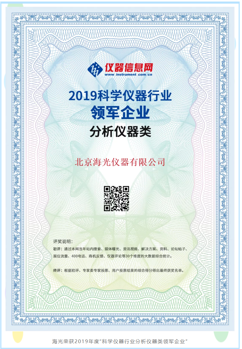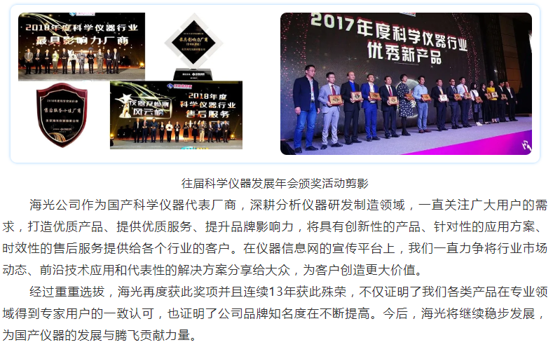 北京海光儀器有限公司是中國儀器儀表行業(yè)協(xié)會常務(wù)理事單位,主要從事分析儀器的研發(fā)、制造、銷售和售后服務(wù), 是中國知名的光譜分析儀器制造廠商,連續(xù)十二年被媒體評為“最具影響力國內(nèi)儀器廠商”稱號,公司通過了質(zhì)量管理體系、環(huán)境管理體系、職業(yè)健康安全體系三大體系認(rèn)證,公司以原子熒光光度計、原子吸收分光光度計、測汞儀、流動分析儀、快速溶劑萃取儀和等離子體發(fā)射光譜儀等分析儀器為主要產(chǎn)品,廣泛應(yīng)用于食品藥品、環(huán)境監(jiān)測、農(nóng)業(yè)、質(zhì)監(jiān)、自來水、檢驗檢疫、地質(zhì)、第三方檢測、科研等領(lǐng)域,產(chǎn)品獲得國家科技進步三等獎、七次BCEIA 金獎、自主創(chuàng)新金獎、國產(chǎn)好儀器等多種獎項。日前,2019年度“科學(xué)儀器行業(yè)領(lǐng)軍企業(yè)”(原“最具影響力廠商”)評選活動獲獎名單揭曉,北京海光儀器有限公司獲分析儀器類領(lǐng)軍企業(yè)稱號,也是連續(xù)十三年獲此殊榮。