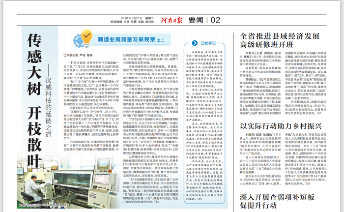 7月7日,《河南日報》要聞版大篇幅報道點贊漢威科技集團,刊出《傳感大樹,開枝散葉——漢威科技的延鏈之道》報道,評價漢威已形成了獨具特色的“以傳感器為核心,智能儀器儀表為支柱,行業(yè)應(yīng)用為導(dǎo)向”的完整產(chǎn)業(yè)鏈,牢牢掌握住了物聯(lián)網(wǎng)產(chǎn)業(yè)鏈的“微笑曲線”的兩端。