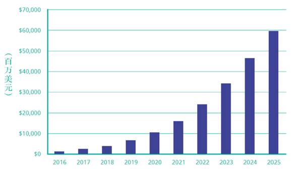 圖1 全球市場中人工智能的收入:2016年~2025年(預測)(來源:Tractica)