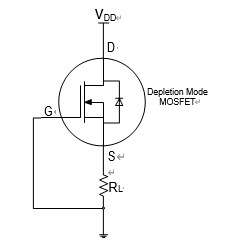 如圖 2 所示,當(dāng) VDD 增加時,流過電路的電流 IDS 增加,導(dǎo)致耗盡型 MOSFET 源極電位 VS 升高,即VGS 絕對值 ∣ VGS ∣ 增加,并引起器件導(dǎo)電溝道變窄,電流增加減緩。在此過程中負(fù)載RL 兩端的電壓VS 無限接近器件的關(guān)斷電壓∣VGS(OFF)∣,VS≈∣VGS(OFF)∣,即 VS 鉗位在∣VGS(OFF)∣處,不再隨輸入電壓 VDD 的增加而變化。負(fù)載 RL 流過的電流 IL (IL = VS / RL)也不隨輸入電壓 VDD 的增加而變化。