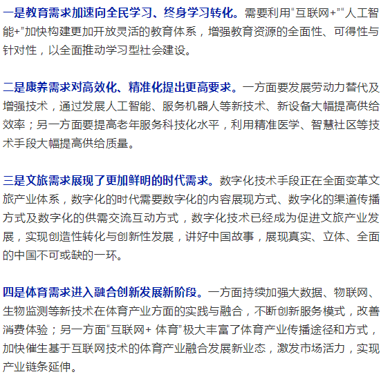 中國特色社會主義進入新時代,我國社會主要矛盾已經(jīng)轉(zhuǎn)化為人民日益增長的美好生活需要和不平衡不充分的發(fā)展之間的矛盾。新時代對美好生活的需求在教育、醫(yī)療健康、養(yǎng)老、托育、家政、文化和旅游、體育等社會服務領(lǐng)域產(chǎn)生了新變化,需要利用新技術(shù)以更高效率、更好質(zhì)量滿足新興需求。新興需求是戰(zhàn)略性新興產(chǎn)業(yè)發(fā)展的重要拉動力,隨著數(shù)字技術(shù)的不斷興起,以數(shù)字文化、數(shù)字教育、數(shù)字醫(yī)療等為代表的戰(zhàn)略性新興服務業(yè)在不斷涌現(xiàn),它們通過實現(xiàn)創(chuàng)新發(fā)展與跨界融合,促進社會服務數(shù)字化、網(wǎng)絡化、智能化、多元化、協(xié)同化,以更好地滿足美好生活的新需求。