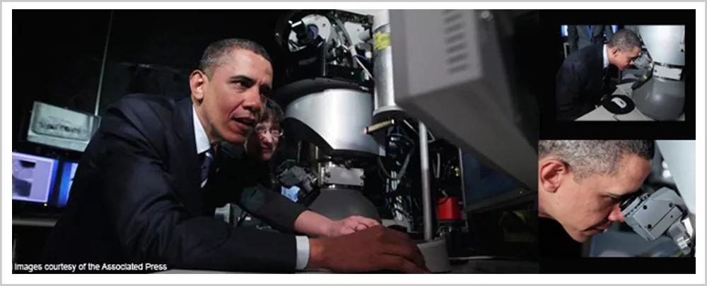 2011年,美國前總統奧巴馬在英特爾參觀TEM實驗室時,用FEI的透射電鏡看到了單個原子,并興奮地表示:“他們讓我對美國的未來感到樂觀。”