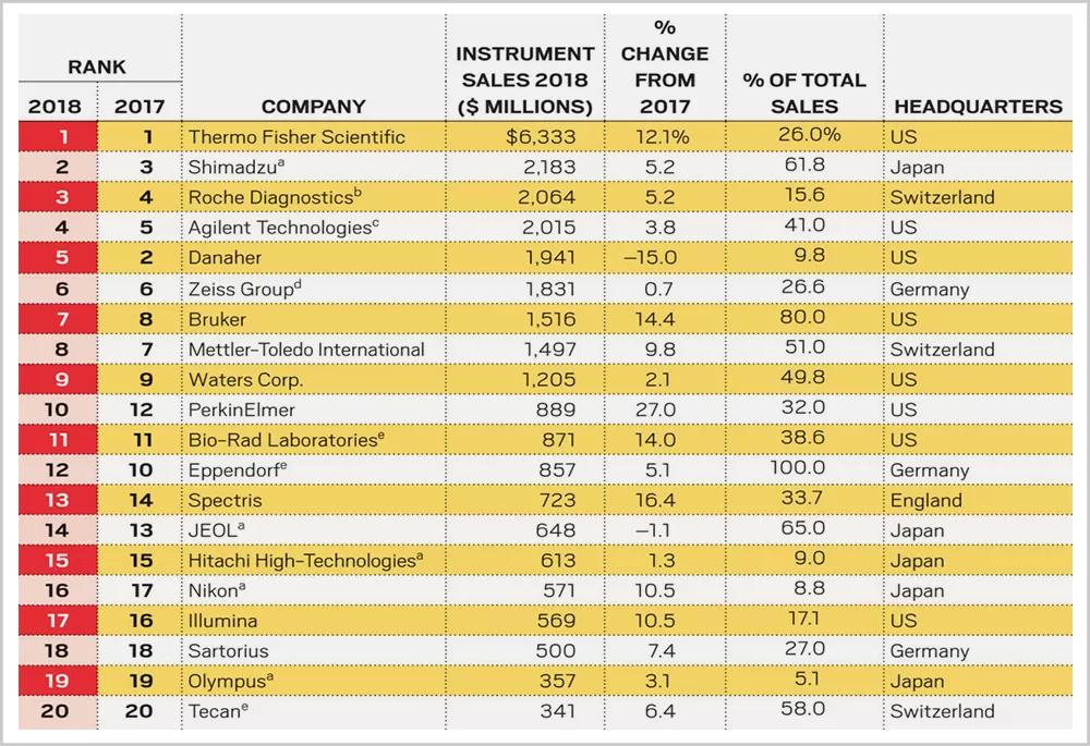 頭號種子賽默飛,自2006年以來共發起200多次并購。2016年,更是斥資42億美元收購了冷凍電鏡廠商FEI。“并購之王”丹納赫,自1986年上市以來,累計收購600多家公司,其中就包括大名鼎鼎的徠卡。一拆一并之下,國內儀器公司與海外巨頭的實力差距,愈發懸殊。截至目前,中國一共有1000多家科學儀器廠,大部分產值低于1000萬元。而據美國化學會的數據,2018年全球科學儀器行業TOP 20,美國8家,歐洲7家,日本5家,沒有一家中國企業。
