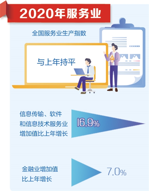 2020年,除批發(fā)和零售業(yè)、住宿和餐飲業(yè)、租賃和商務(wù)服務(wù)業(yè)外,其他行業(yè)均實(shí)現(xiàn)正增長(zhǎng)。其中,信息傳輸、軟件和信息技術(shù)服務(wù)業(yè)增加值增速為16.9%,實(shí)現(xiàn)兩位數(shù)增長(zhǎng);金融業(yè)增加值增速為7.0%,比2019年提高0.4個(gè)百分點(diǎn)。這兩個(gè)行業(yè)對(duì)經(jīng)濟(jì)增長(zhǎng)的貢獻(xiàn)率合計(jì)達(dá)到54.1%,有力支撐了經(jīng)濟(jì)較快恢復(fù)。
