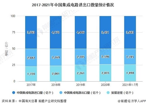截止至2021年7月,我國(guó)累計(jì)進(jìn)口集成電路3683億個(gè);出口集成電路1785億個(gè),貿(mào)易逆差為1898億個(gè)。