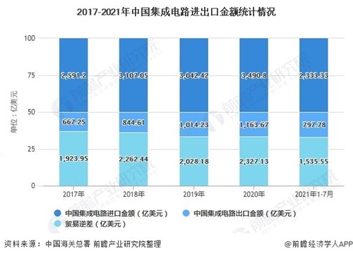 截止至2021年7月,我國(guó)集成電路行業(yè)進(jìn)口金額達(dá)到2333.33億美元,出口金額達(dá)到797.78億美元,貿(mào)易逆差實(shí)現(xiàn)1535.55億美元。
