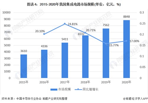 圖表4:2015-2020年我國(guó)集成電路市場(chǎng)規(guī)模(單位:億元,%)