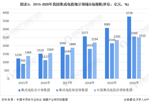 圖表5:2015-2020年我國(guó)集成電路細(xì)分領(lǐng)域市場(chǎng)規(guī)模(單位:億元,%)
