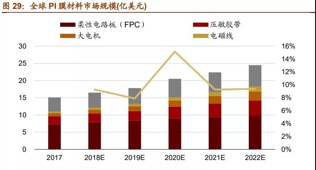 PI 薄膜是市場規(guī)模最大的聚酰亞胺細(xì)分領(lǐng)域。2010 年以來,智能手機(jī)、電子顯示、柔 性電路板等領(lǐng)域快速發(fā)展,驅(qū)動 PI 薄膜產(chǎn)業(yè)快速發(fā)展。在 5G 與消費(fèi)電子創(chuàng)新周期的 驅(qū)動下,天線材料、電子元器件、柔性顯示等領(lǐng)域有望維持強(qiáng)勁的發(fā)展勢頭。另外,主 要國家在航空航天領(lǐng)域加大投入,將會拉動高性能特種 PI 膜的需求。