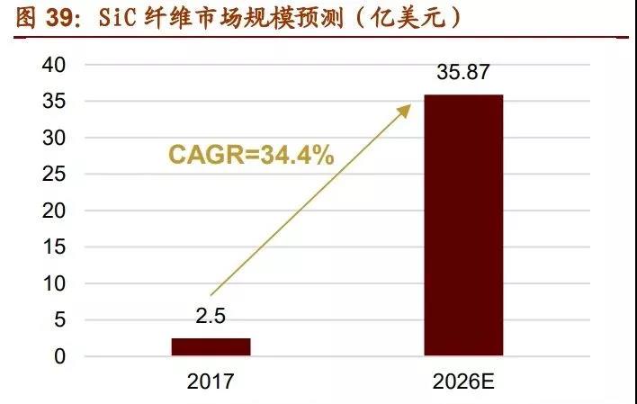 據(jù)不完全統(tǒng)計(jì),2015 年全球連續(xù)碳化硅纖維的總產(chǎn)量達(dá) 300 噸。未來幾年,隨著美日 主要生產(chǎn)商進(jìn)一步擴(kuò)產(chǎn),中國、中東生產(chǎn)商入局,預(yù)計(jì)世界碳化硅纖維總產(chǎn)量至 2025 年有望增長至 500 噸左右。根據(jù) Stratistics MRC 預(yù)測,SiC 纖維市場 2017 年的估值為 2.5 億美元左右。隨著 SiC 纖維的研究工作不斷深入、使用場景逐步增加,其市場需求 有望快速擴(kuò)大。預(yù)計(jì)到 2026 年 SiC 纖維的市場規(guī)模將增長至 35.87 億美元,復(fù)合年增 長率將達(dá)到 34.4%。