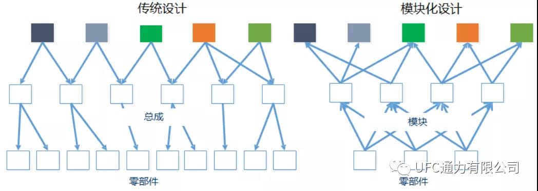 模塊化設(shè)計(jì)是將產(chǎn)品中的某些要素(如零部件、標(biāo)準(zhǔn)件、軟件控制程序等)組合在一起,構(gòu)成一個(gè)具有特定功能的子系統(tǒng),并將這個(gè)子系統(tǒng)作為通用性的模塊與其他產(chǎn)品要素進(jìn)行多種組合,構(gòu)成新的系統(tǒng),產(chǎn)生多種不同功能或相同功能但不同性能的系列產(chǎn)品。與傳統(tǒng)設(shè)計(jì)相比,如圖1所示,模塊化設(shè)計(jì)能夠幫助企業(yè)使用盡可能少的零部件,更少的制造設(shè)備、工模具,更低的采購(gòu)成本,生產(chǎn)出更多的產(chǎn)品種類,滿足市場(chǎng)的多樣化需求。