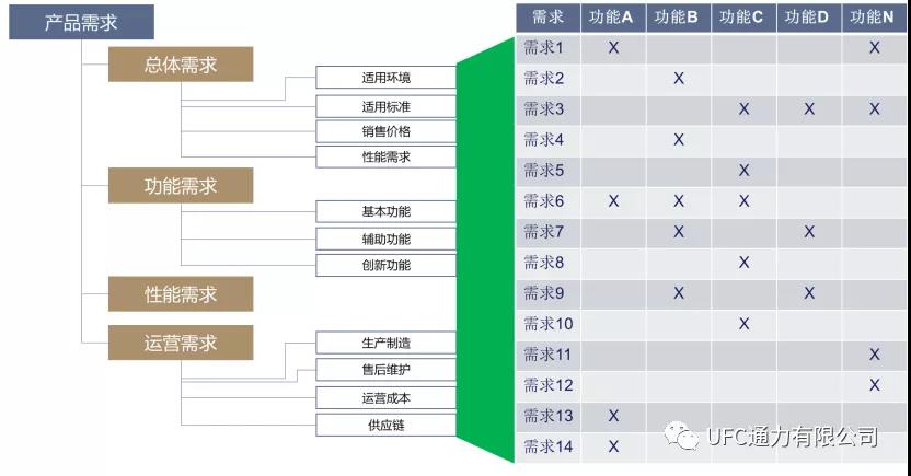 完成產(chǎn)品規(guī)劃以后,就需要考慮如何搭建滿足市場(chǎng)需求的產(chǎn)品平臺(tái)。通常的做法是基于歷史訂單的分析和產(chǎn)品規(guī)劃結(jié)果,進(jìn)行產(chǎn)品功能與需求之間的匹配,從而實(shí)現(xiàn)產(chǎn)品功能的解構(gòu),并最終形成產(chǎn)品功能架構(gòu)(見(jiàn)圖3所示),并以層次推演的方式進(jìn)行表達(dá)。