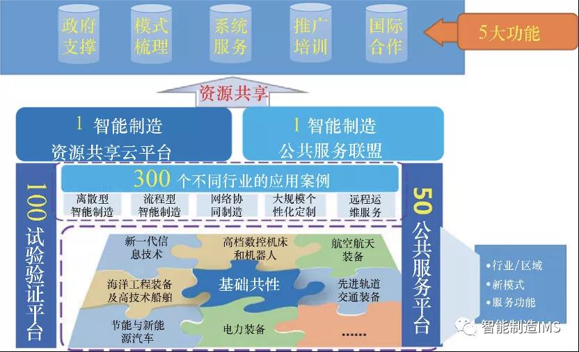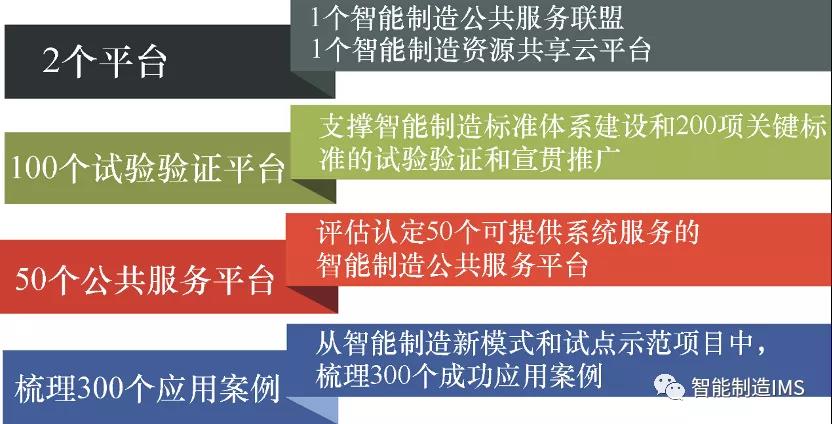 “2”是打造兩個平臺———1 個智能制造公共服務(wù)聯(lián)盟和1 個智能制造資源共享云平臺; “1”是100 個試驗驗證平臺———從已建成或擬建成的智能制造綜合標準化項目的標準實驗驗證平臺中, 評估認定100 個平臺, 用于支撐智能制造標準體系建設(shè)及200 項關(guān)鍵標準試驗驗證和宣貫推廣的基地; “5”是50 個公共服務(wù)平臺———從智能制造綜合標準化項目標準試驗驗證平臺、地方自助或企業(yè)自建的服務(wù)平臺中, 評估認定50 個可提供系統(tǒng)服務(wù)的智能制造公共服務(wù)平臺; “3”是300 個應用案例———從智能制造新模式和試點示范項目中, 梳理出300 個典型成功應用案例, 面向不同行業(yè)、領(lǐng)域推廣智能制造新模式和成功經(jīng)驗, 甚至直接復制智能工廠/ 數(shù)字化車間。