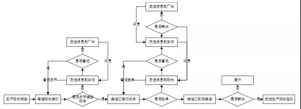 維修工接單后,到達指定位置對設備維修,維修結(jié)束后發(fā)送維修完成的消息給生產(chǎn)班長進行驗收,驗收通過后由生產(chǎn)班長結(jié)束流程。在報修流程中有幾個關(guān)鍵點是保證維修任務及時完成的關(guān)鍵點: