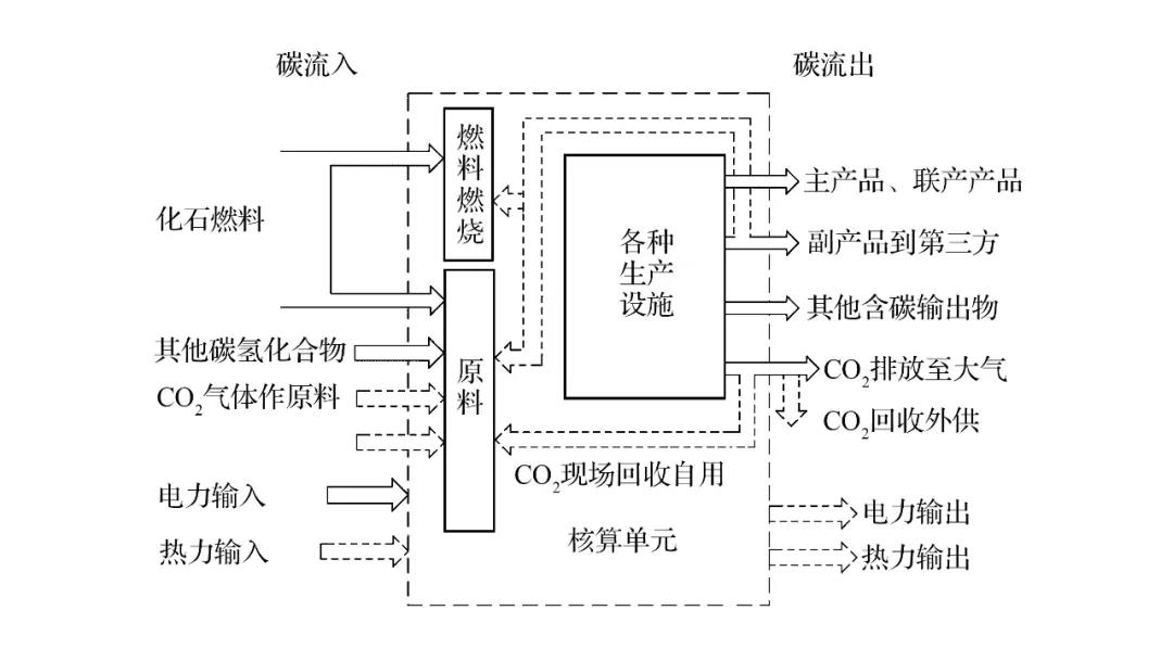 參照《溫室氣體排放核算與報告要求第10部分:化工生產(chǎn)企業(yè)》(GB/T32151.10—2015),化工生產(chǎn)企業(yè)的溫室氣體排放為各個核算單元的化石燃料燃燒產(chǎn)生的二氧化碳排放、生產(chǎn)過程中的二氧化碳排放和氧化亞氮等其他溫室氣體排放,以及購入電力、熱力產(chǎn)生的二氧化碳排放之和,同時扣除回收且外供的二氧化碳的量,以及輸出的電力、熱力所對應的二氧化碳量。化工企業(yè)按圖2所示識別碳源流,并分別核算。