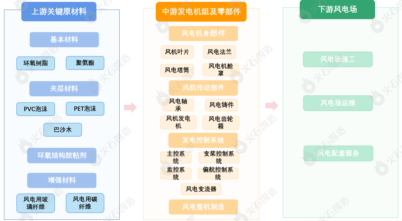 從風電產(chǎn)業(yè)鏈看,上游包括環(huán)氧樹脂和聚氨酯等基本材料、PVC泡沫和巴沙木等夾層材料、以及環(huán)氧結(jié)構(gòu)膠粘劑、增強材料等;中游包括風電機身部件、風電傳動部件、發(fā)電控制系統(tǒng)和風電整機制造等;下游包括風電場施工、運維即配套服務等。