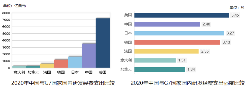 圖2 中國與G7國家研發(fā)經費投入規(guī)模及強度比較(2020年)