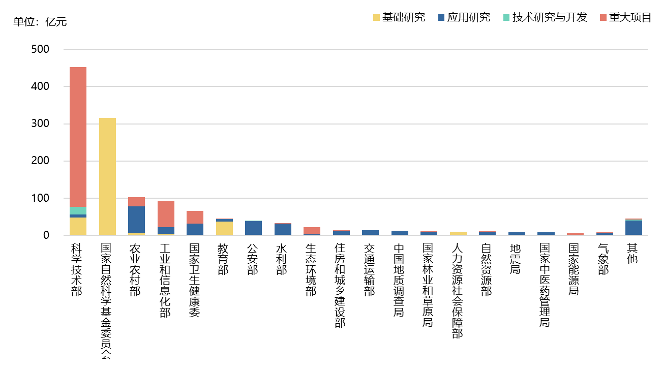 中央政府研發(fā)經費主要由少數部門管理。在40個中央政府研發(fā)經費管理部門中,科學技術部和國家自然科學基金委員會(簡稱“基金委”)管理經費規(guī)模均超過300億元,占中央40個部門管理研發(fā)經費總支出的50%以上。就研發(fā)經費管理的類型而言,國家基金委經費全部用于基礎研究;科技部和工業(yè)和信息化部研發(fā)經費主要用于重大項目;農業(yè)農村部則將經費主要用于應用研究。