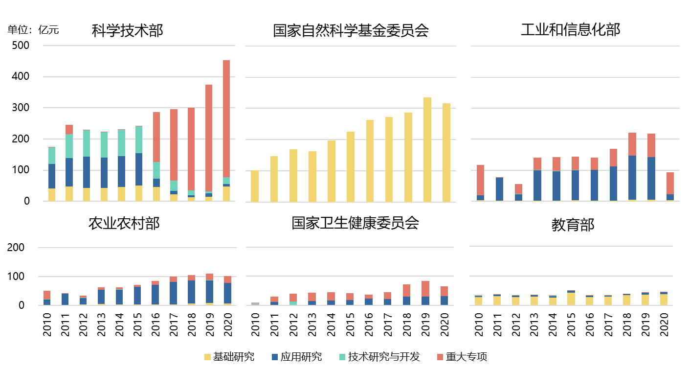 從時間上看,過去十年,科學技術部和基金委研發(fā)經費總量大且呈上升趨勢;農業(yè)農村部研發(fā)經費總量于2020年首次超過工業(yè)和信息化部,躍居第三位;衛(wèi)健委和教育部研發(fā)經費總量保持穩(wěn)定。
