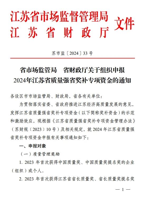 1、設(shè)區(qū)市市場監(jiān)管局和省級部門預(yù)算單位匯總填報《2024年江蘇省質(zhì)量強省獎補資金申報匯總表》(附件1)。